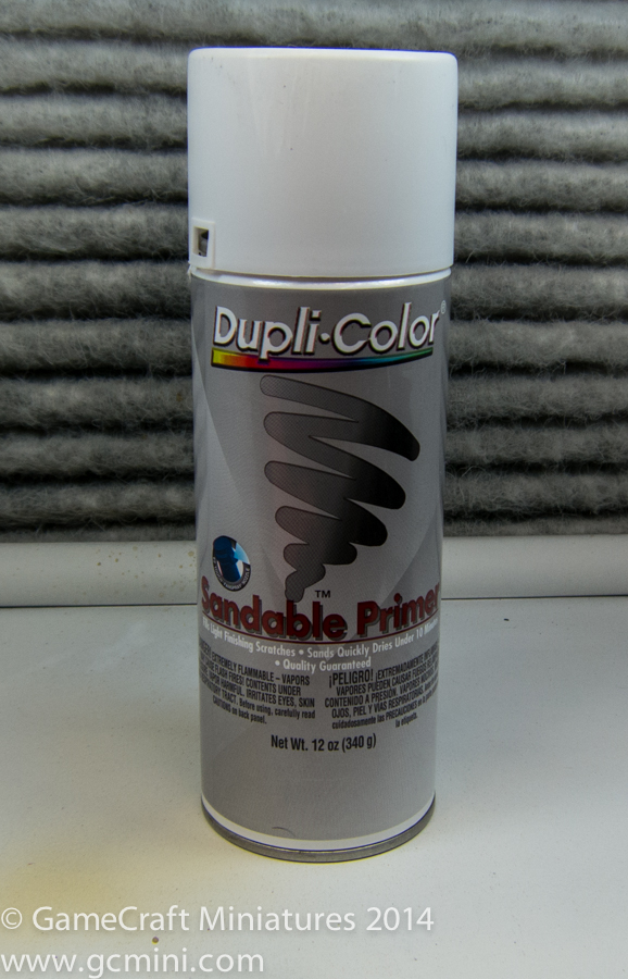 I’ve been building models for about 40 years and doing it professionally for about 30 years … in that time I think I’ve used every possible type of paint available.  But in all that time I have never found the perfect primer for pewter miniatures.  … perhaps until now.   This white primer from Dupli-Color (available at most auto parts stores in America) might be the best primer for soft metal castings I’ve ever found.  First, it’s not just a flat white paint, it’s a real primer that attaches to the metal and hangs on nicely.  Also it does not go on in thick coats that would destroy details on such small miniatures (see photo of primered BMPs).