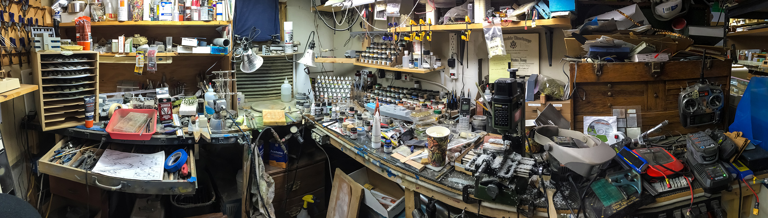 This is a photo of what my personal workbench looked like earlier tonight. It’s a fucking disaster, I can barely get anything done there. Most of the time I spend out in the shop is devoted to filling orders for my customers but there is no excuse for this disaster. I’ll be doing some major reorganizing over the next day or two … or more. Stay tuned for a whole new look and me getting back to the point where I can actually work on some micro armor again.
