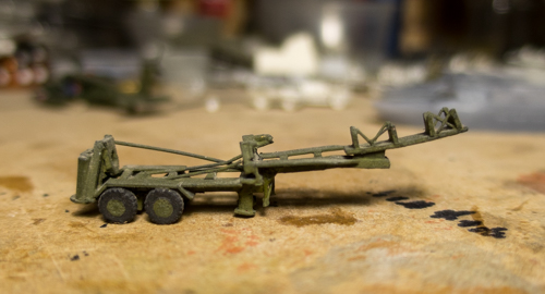 Thirty two years ago (1984) I scratchbuilt this Pershing Missile trailer/launcher. It’s mostly tiny bits of thin styrene plastic. This thing has been bouncing around in my miniatures box ever since. I never actually made the missile because at the time I was working only with hand tools and could not come up with an easy way to make a missile.