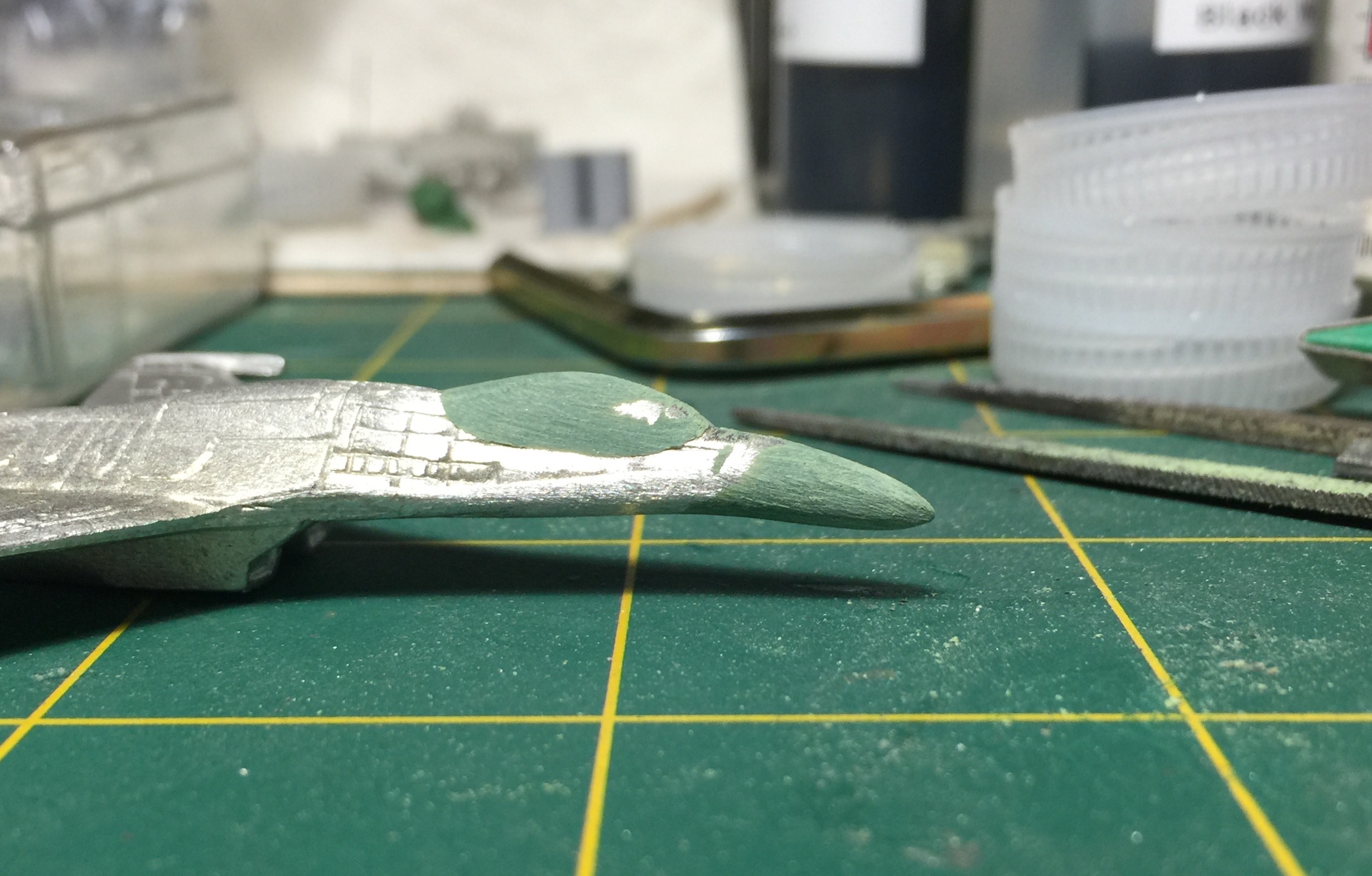 I’m working on trying to save this Su-27 Flanker from I-94 Enterprises and I’m not sure it’s worth all the work. I’ve shaved off that horrible strange tumor that was growing on the underside of the nose. Now I’m adding Green Stuff to re-sculpt the canopy and the radome so they look at least a little bit like the Su-27. I’m going to try to see this project through to the end … but It’s really not feeling like it will be worth all the effort.