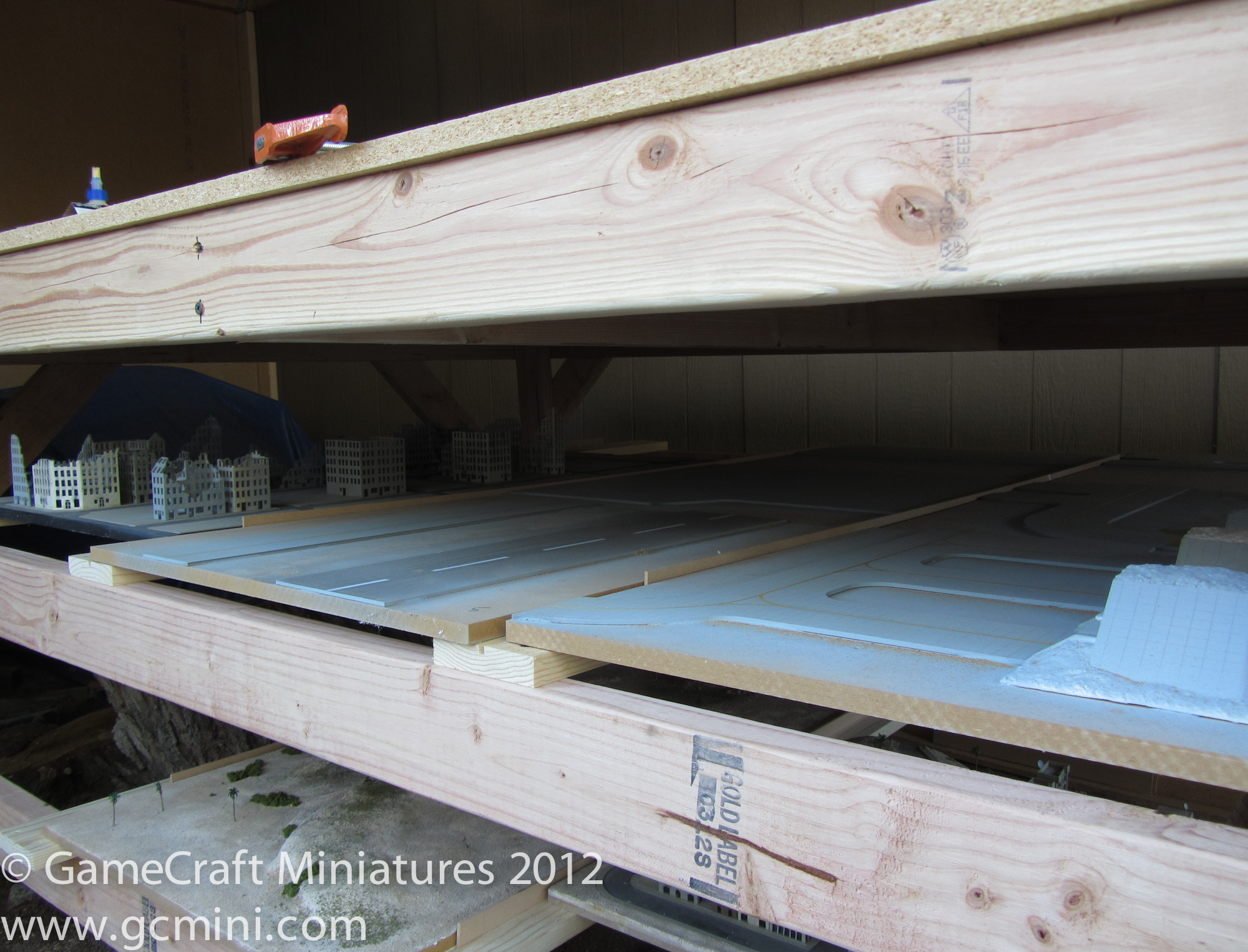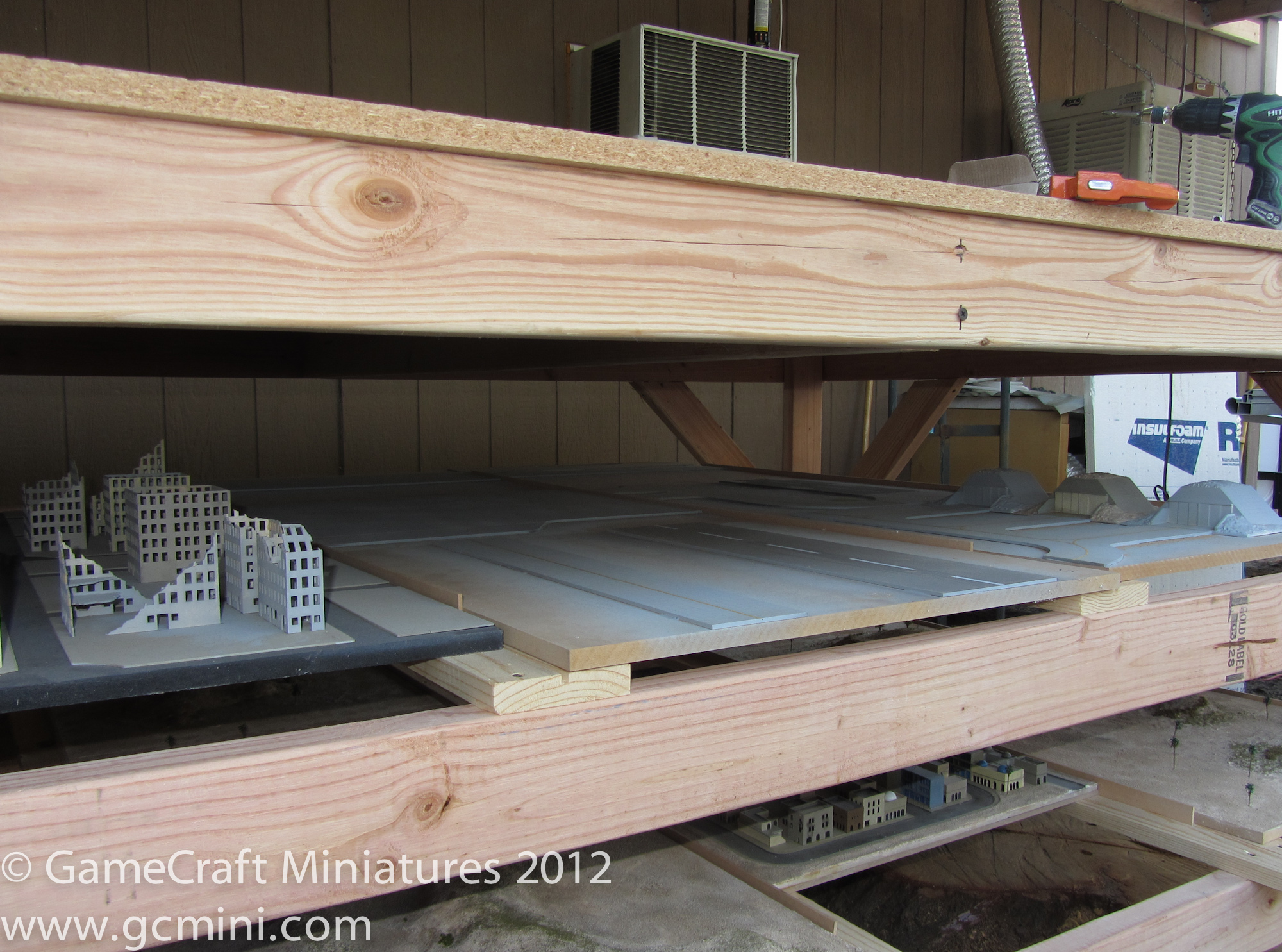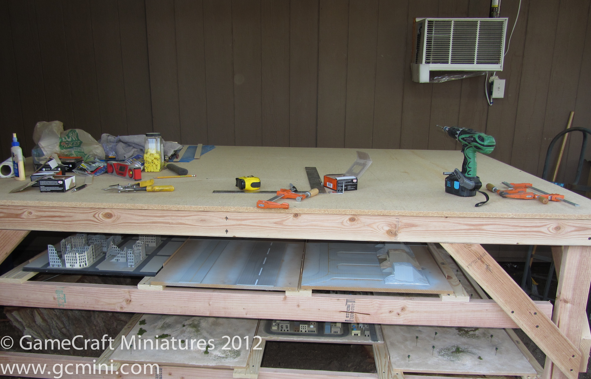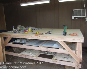 My new gaming table has room to store 18 game boards underneath and can accommodate 15 boards on top in a 3×5 arrangement (with the end boards hanging off the ends 2″ each) or a 3×4 arrangement with room on the table at each end for papers, rule books, dice, sodas, beer, pretzels, etc.