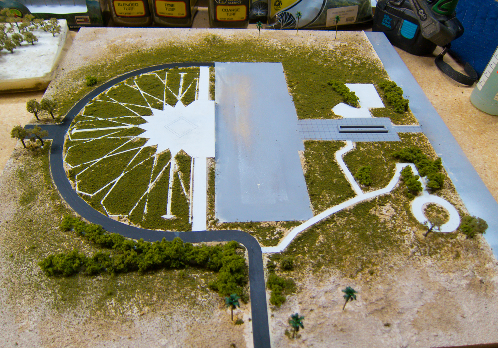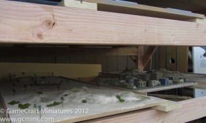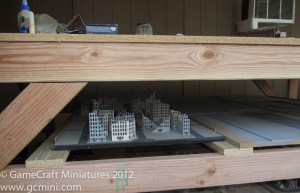 The first photo shows the area being considered, shown in 4 20″ x 20″ boards. The next two show my existing Iraqi MoJ building model.