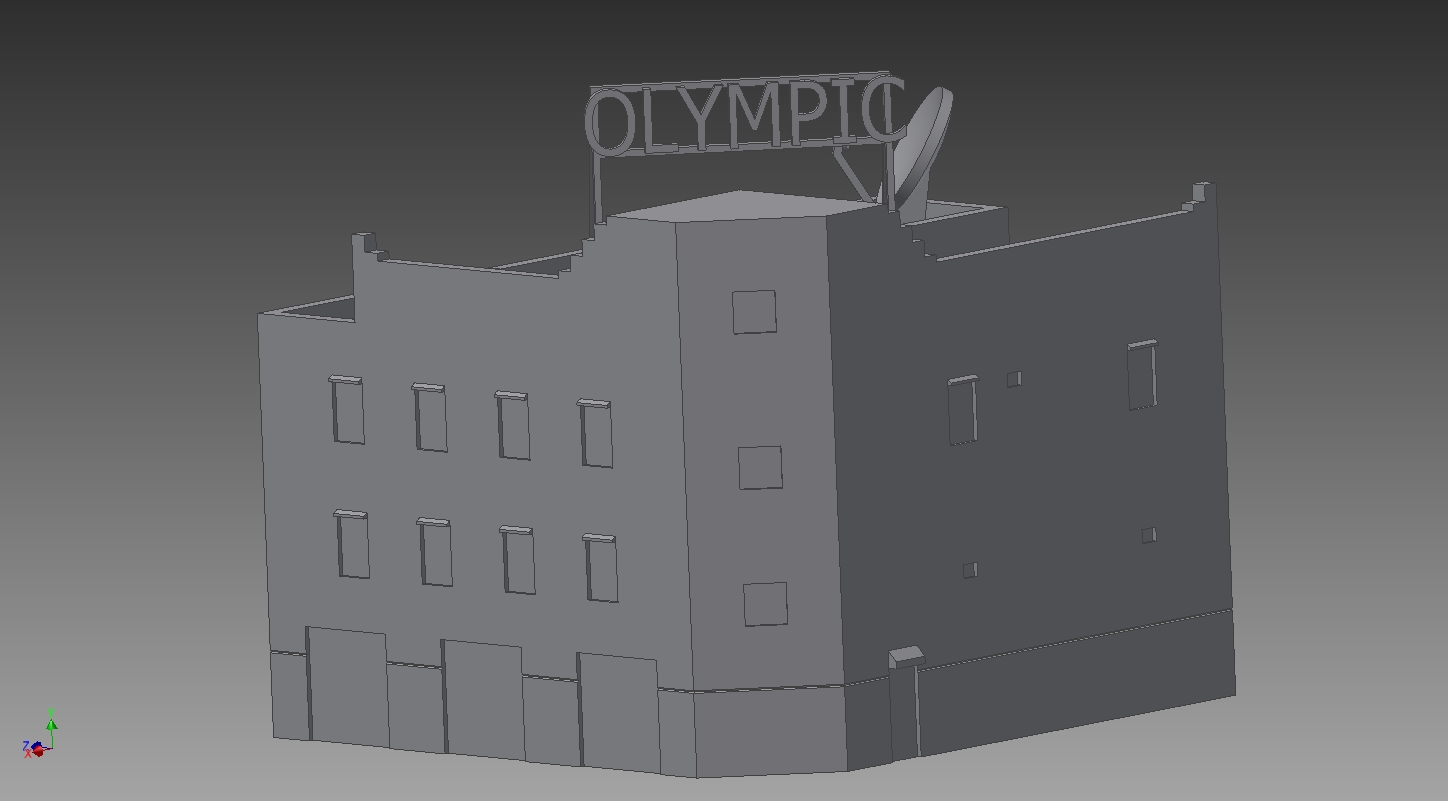 New Design Posted on February 29, 2016 by Allen Reply Tonight I’m working on a design for the Olympic Hotel from the movie Blackhawk Down. This should go very nicely with my “Target Building” model.