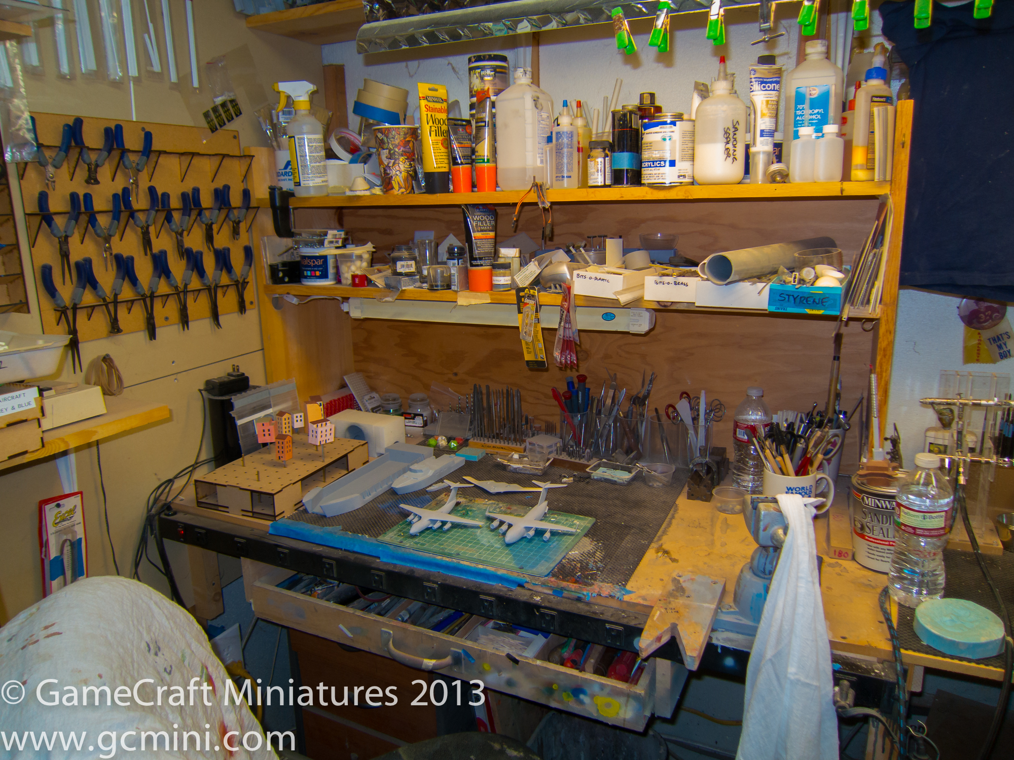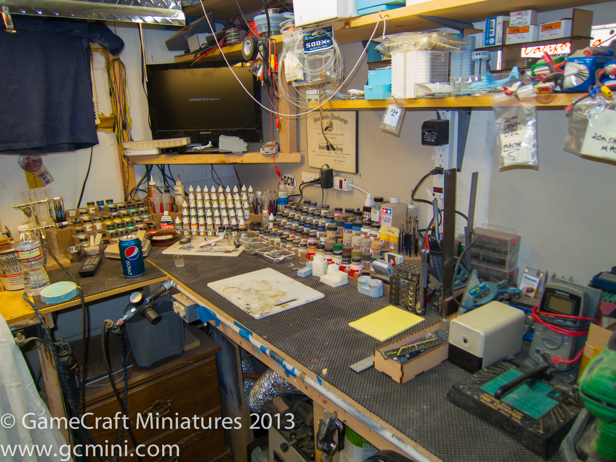This is a photo of what my personal workbench looked like earlier tonight. It’s a fucking disaster, I can barely get anything done there. Most of the time I spend out in the shop is devoted to filling orders for my customers but there is no excuse for this disaster. I’ll be doing some major reorganizing over the next day or two … or more. Stay tuned for a whole new look and me getting back to the point where I can actually work on some micro armor again.